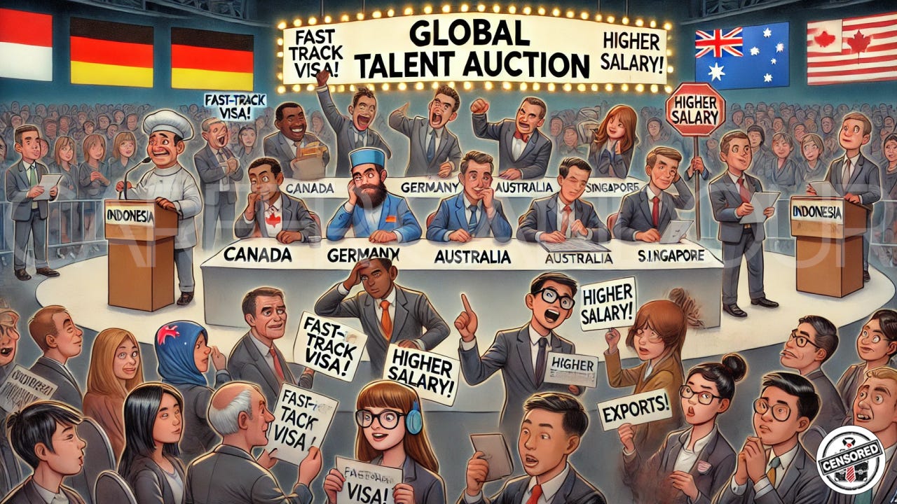 Now, it’s not just companies that are hunting for talent. Countries (entire governments) are sliding into Indonesians' DMs with job offers. Canada wants you. Germany wants you. Australia is practically waving at you from across the street, shouting, “Hey, remember us? We have healthcare!”