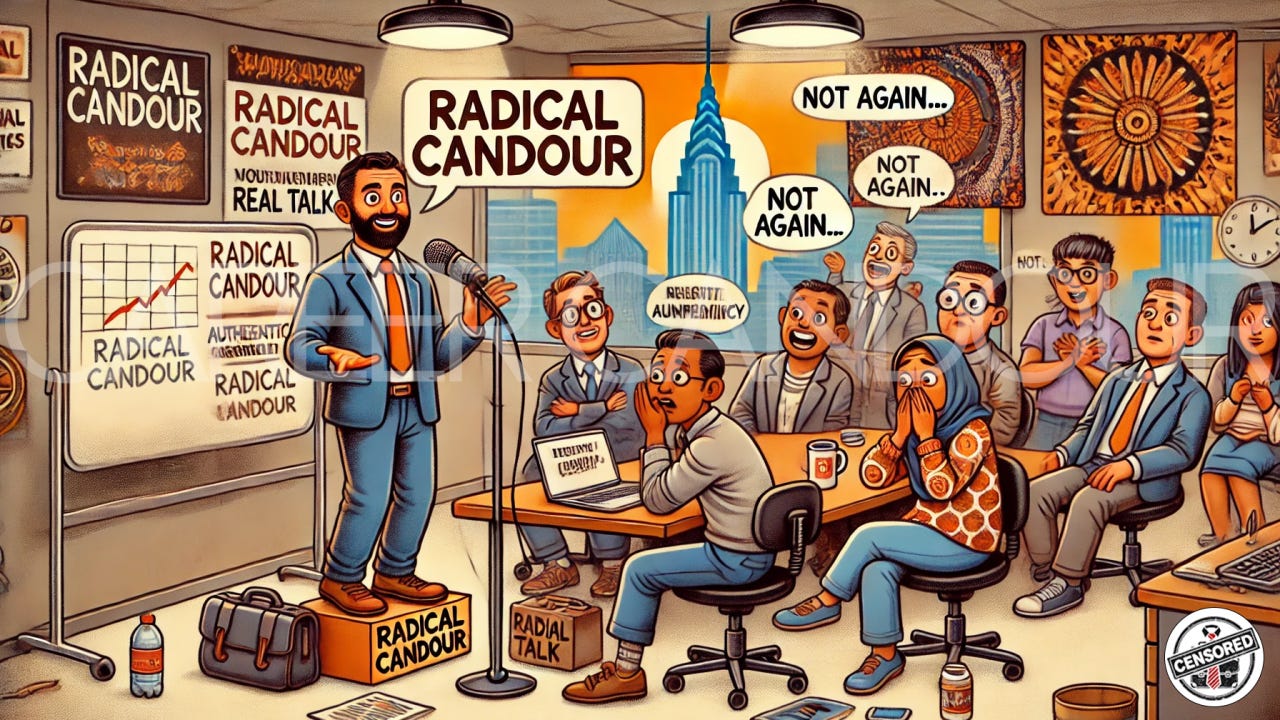 Radical Candour has fast become the preferred leadership Kool-Aid, sipped by founders, HR departments, and anyone who once read half a business book on a flight to Bali. On the surface, it sounds like the perfect solution to corporate dysfunction: speak your truth, but do it with a warm, supportive hand on the recipient’s shoulder. Simple. Neat. Marketa…
